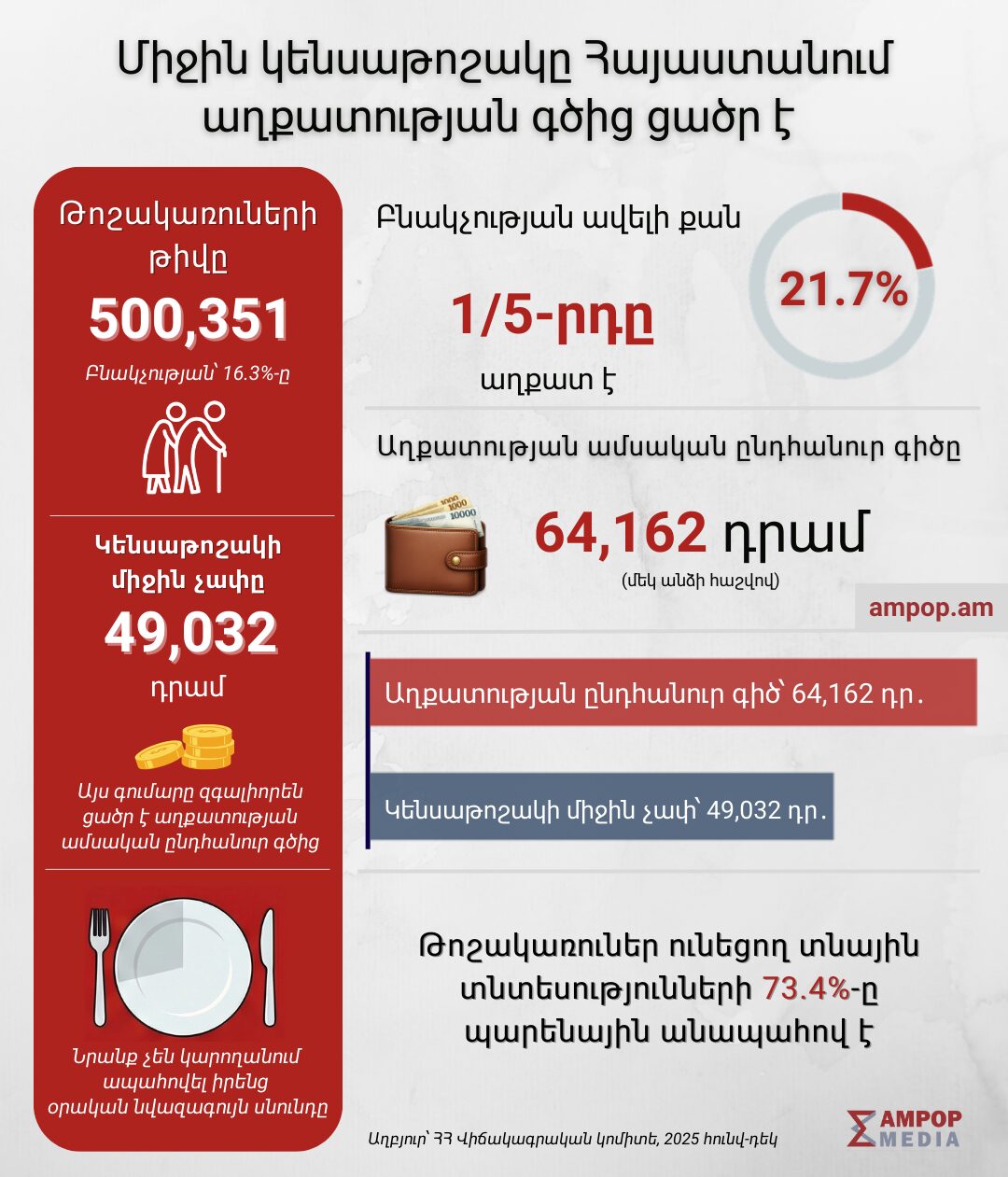 ՀՀ վիճակագրական կոմիտեն փետրվարի 25-ին հրապարակել է «Պարենային ապահովություն և աղքատություն» զեկույցը, որը բացահայտում է երկրում սոցիալական ծանր պատկերը։ Ըստ պաշտոնական տվյալների՝ Հայաստանում աղքատության մակարդակը գնահատվել է 21.7%։