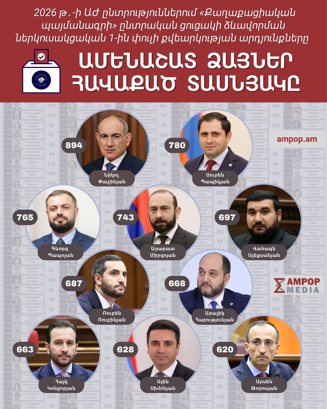 Հատկանշական է, որ ԱԺ նախագահ Ալեն Սիմոնյանը հայտնվել է 9-րդ հորիզոնականում (628 ձայն)։