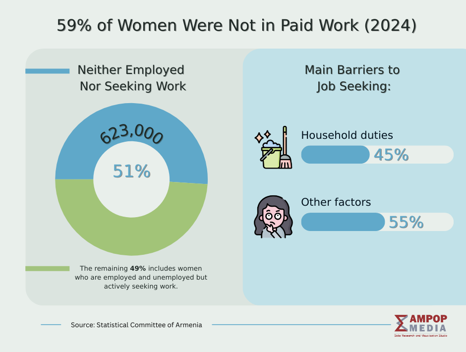 In 2024, 59% of Armenian women were not in paid work, according to the Statistical Committee. Among women aged 15–74, 51%—about 623,000—were either unemployed or not seeking work, most of them (45%) primarily engaged in household duties.