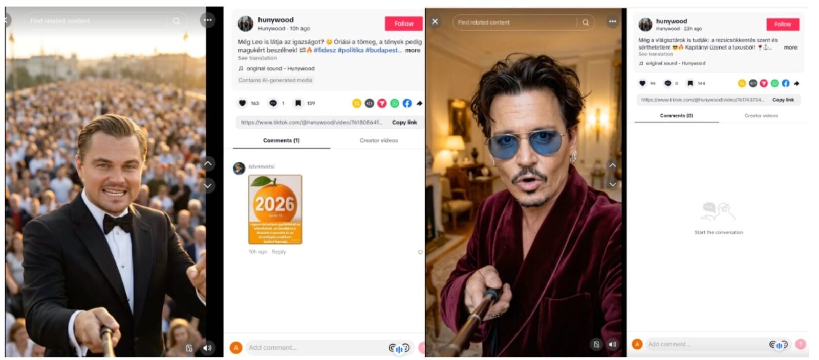 Անանուն օգտատիրոջ գրառումներում Լեոնարդո ԴիԿապրիոյի (ձախից) և Ջոնի Դեփի (աջից) ԱԲ-ով ստեղծված տեսանյութերը՝ ընտրողներին զգուշացնելու չաջակցել Մադյարին (պատկերը՝ NewsGuard-ի)։