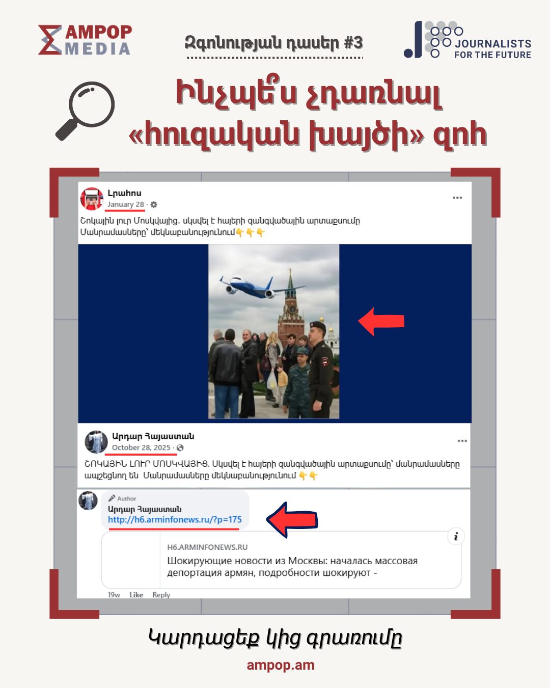 ℹ️ «Զգոնության դասեր» շարքը «Ամփոփ Մեդիայի» և «Լրագրողներ հանուն ապագայի» (JFF) ՀԿ-ի համատեղ կրթական նախաձեռնությունն է։ Մեր նպատակն է զինել լսարանին մեդիագրագիտության գործնական հնարքներով և փաստերի ստուգման պարզ գործիքներով՝ թվային դարաշրջանում տեղեկատվական մանիպուլյացիաներին դիմակայելու համար։