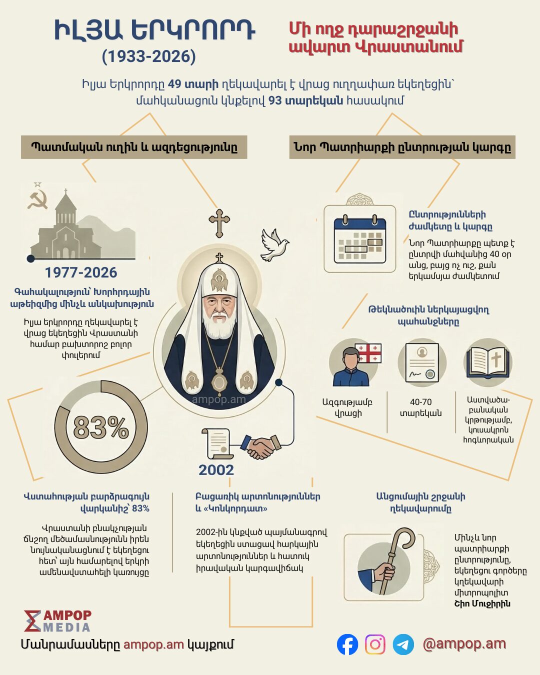 93 տարեկան հասակում վախճանվել է վրաց ուղղափառ եկեղեցու առաջնորդ Իլյա Երկրորդը։ Նա ղեկավարել է վրաց եկեղեցին գրեթե հինգ տասնամյակ՝ դառնալով ժամանակակից Վրաստանի պատմության ամենաազդեցիկ և հարգված դեմքերից մեկը։ Պատրիարքի մահվան մասին մարտի 17-ի ուշ երեկոյան հայտնել է պատրիարքի տեղապահ, միտրոպոլիտ Շիո Մուջիրին։