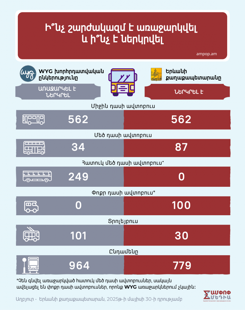 Բրիտանական WYG խորհրդատվական ընկերությունը 160-էջանոց հաշվետվությամբ առաջարկել էր երևանյան տրանսպորտային համակարգում փոխել ամեն ինչ՝ ավտոբուսներից ու տրոլեյբուսներից մինչև կանգառասրահների, երթուղիների ու տրանսպորտային հանգույցների փոփոխություն/ավելացում։ Առաջարկվել է նաև ուղեվարձի կանխիկ ընդունման տարբերակից անցում կատարել դեպի անկանխիկ վճարման համակարգի, սակայն WYG–ը սակագնի առաջարկ չի արել, քանի որ, ըստ Երևանի քաղաքապետարանի «Ամփոփ Մեդիա»-ին տրամադրած տեղեկության, WYG ընկերության առջև նման խնդիր դրված չի եղել: