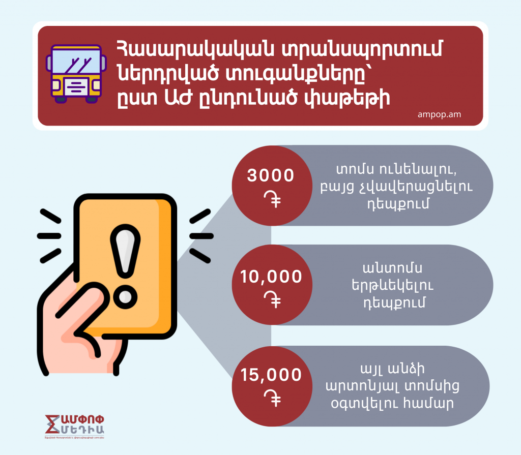 Երևանյան ավտոբուսներում ու տրոլեյբուսներում արդեն սկսել են աշխատել հսկիչներ՝ հատուկ սարքերով։ Իսկ օգոստոսից դադարեցվել է թղթային QR տոմսերի շրջանառությունը։ Նոր համակարգը ենթադրում է վճարում բանկային քարտով, տրանսպորտային քարտով կամ բջջային հավելվածով։ Սակայն տեխնոլոգիական նորամուծությունը նոր խնդիրներ է առաջացրել, քանի որ աշխատում է խափանումներով։