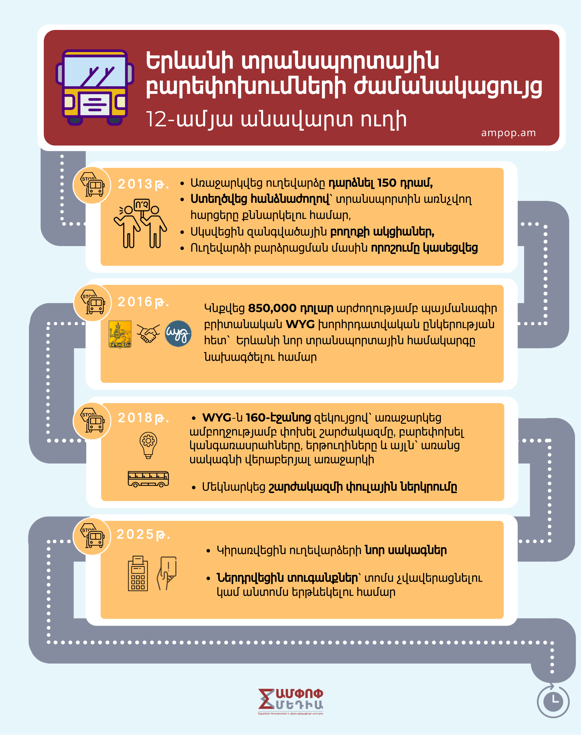 Երևանի տրանսպորտային համակարգի բարեփոխումների թեման նոր չէ․ պաշտոնապես այն օրակարգ մտավ դեռ 2012–2013 թվականներին, երբ քաղաքապետարանը խոստանում էր «քաղաքակիրթ, եվրոպական չափանիշներին համապատասխան տրանսպորտային ցանց»։ Բայց ավելի քան տասներկու տարի անց երևանցին շարունակում է երթևեկել նույն խցանումների միջով, նույն տոթ ու մարդաշատ ավտոբուսներով։