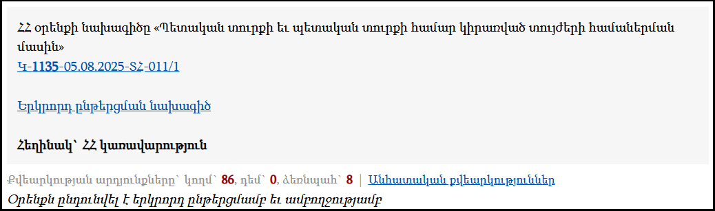 Օրենքն Ազգային ժողովում ընդունվել է դեկտեմբերի 4-ին՝ 86 կողմ, 8 ձեռնպահ և զրո դեմ ձայների հարաբերակցությամբ։ Նախագիծը ԱԺ էր ներկայացրել կառավարությունը՝ Տարածքային կառավարման և ենթակառուցվածքների նախարարության միջոցով։